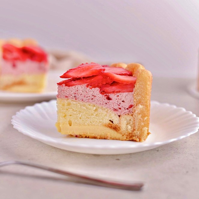 Frozen cake – leche flan, vanilla chiffon, and lady fingers, soaked in tres leches, topped w/ strawberry mousse and fresh strawberries.